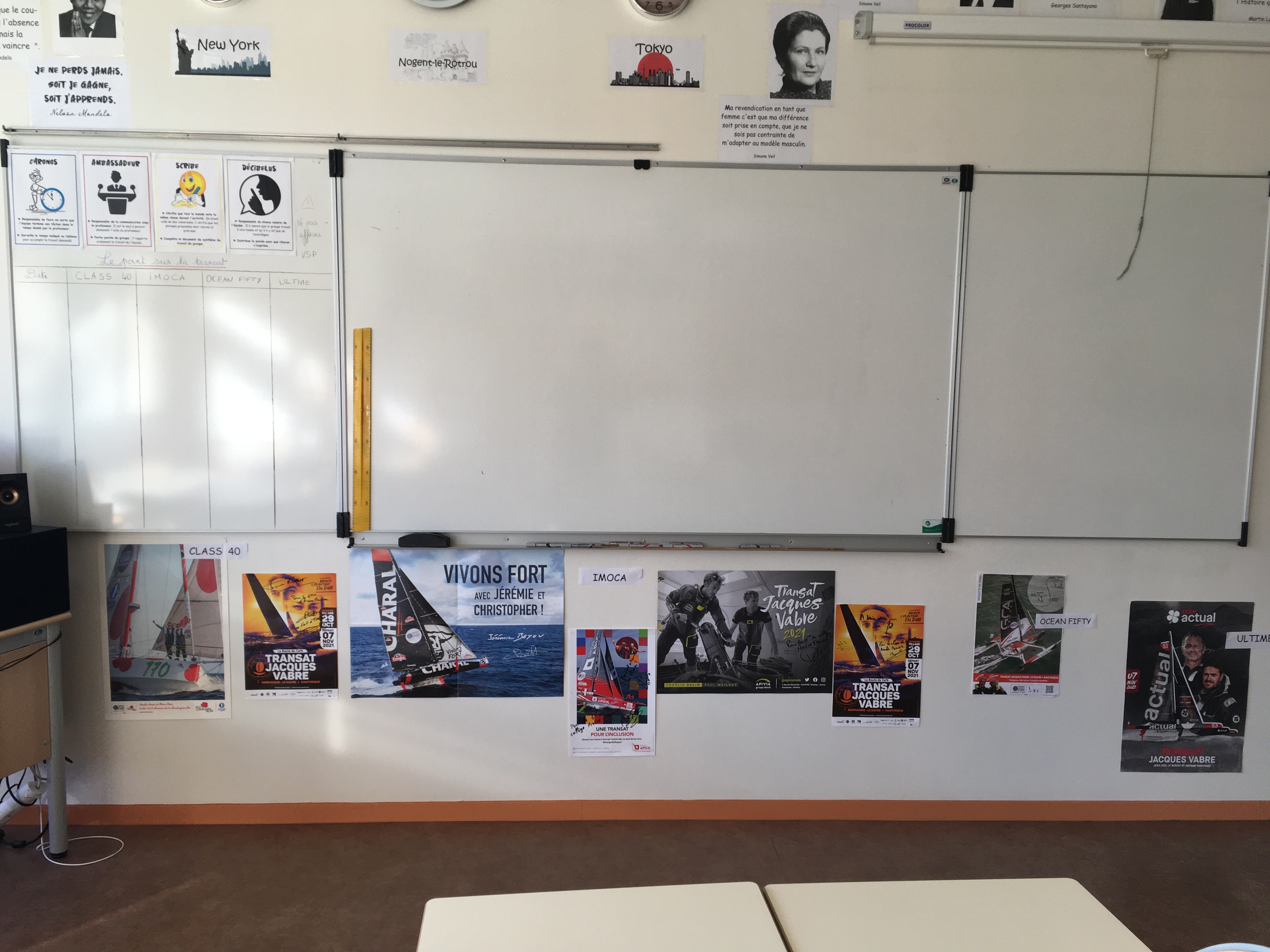 Au retour des vacances de la Toussaint, les classes de 6ème B, C et D ont commencé leur projet de l'année sur le thème : Voyage, Voyages ! Il s'agit d'un projet pluridisciplinaire regroupant la géographie, le français, l'éducation musicale, les arts plastiques et l'EMI.En géographique, l'objectif est de construire un carnet de voyage sur l'année. Le point de départ de notre étude a débuté la semaine dernière avec un suivi quotidien des skippers de la Transat Jacques Vabre. Ces derniers ont laissé quelques petits messages sympathiques aux élèves pour les encourager dans cette initiation au voyage. La seconde étape sera réalisée en arts plastiques avec la customisation de la couverture du carnet par un technique de superposition de collage. La Transat Jacques Vabre en quelques chiffres