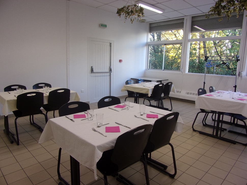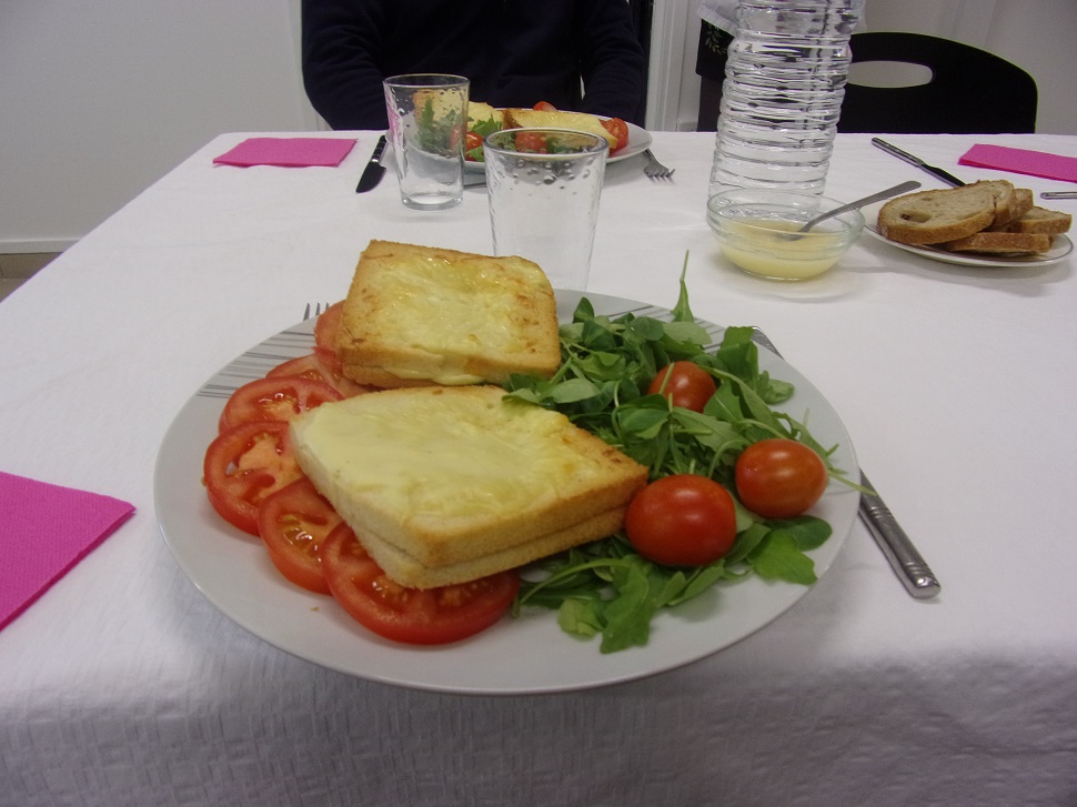 Au menu : Croque-Monsieur et sa salade, tarte aux abricots et aux poires et café.Tables dressees
