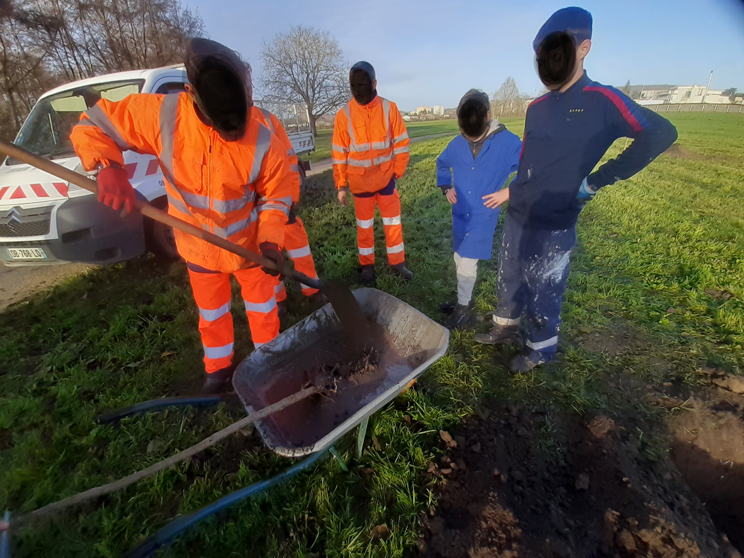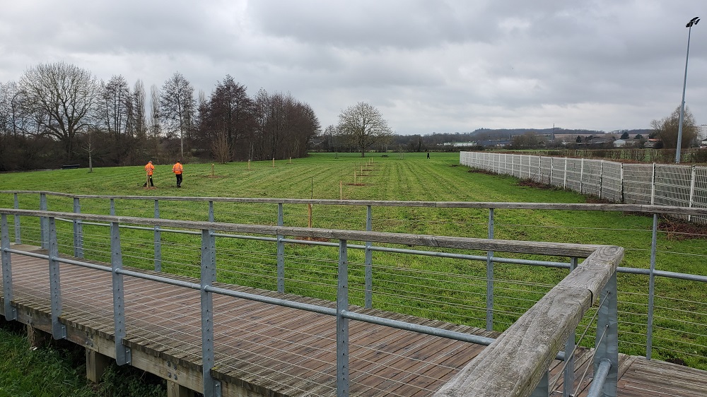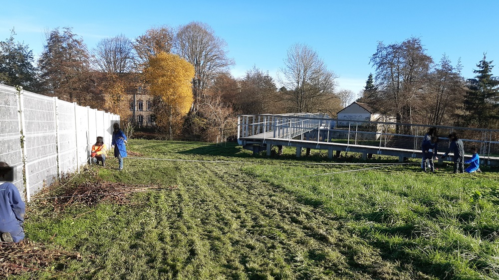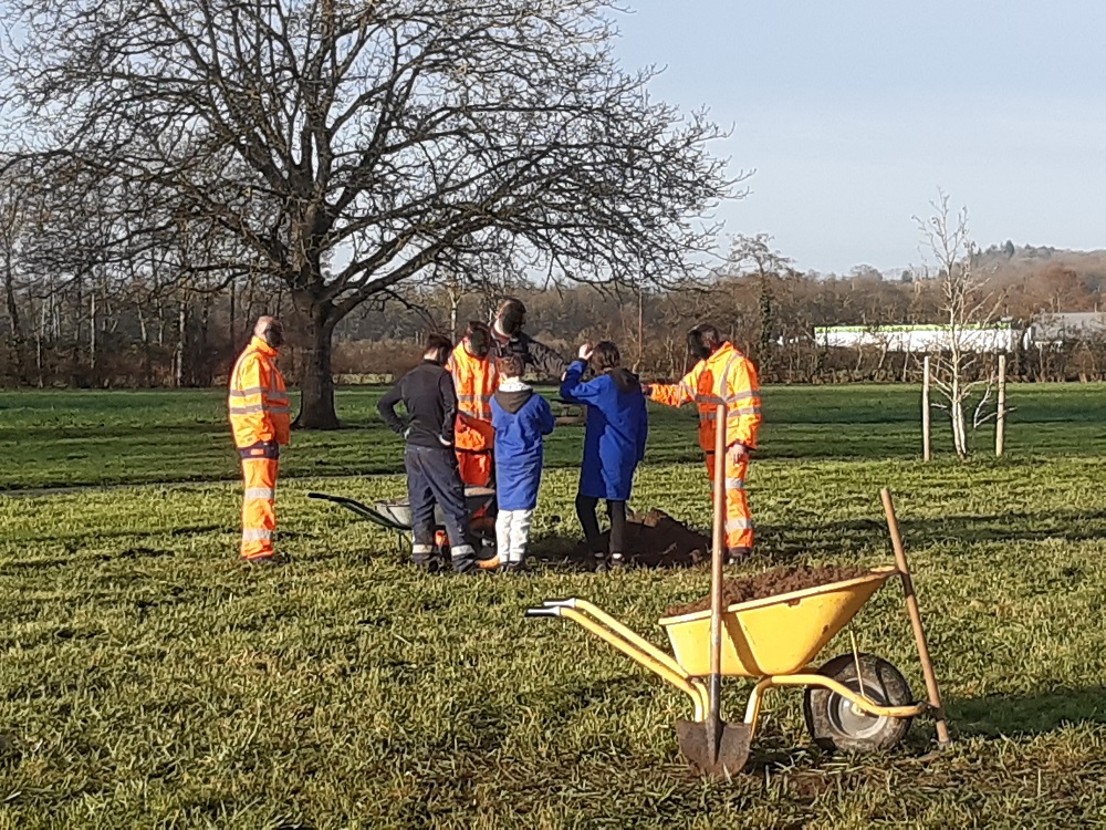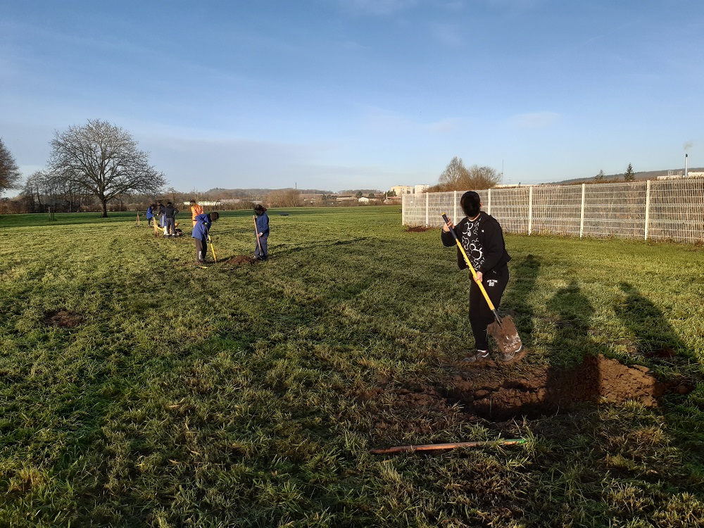 Deuxième étape : Les élèves de 4e et 3e segpa ont planté avec l'aide des services techniques de la ville de Nogent-le-Rotrou un verger de 12 arbres. Ces 12 arbres seront à greffer dès l'arrivée des premières feuilles, au printemps, avec des greffons de variétés locales.