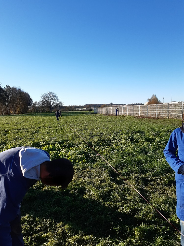 Première étape pour les élèves de 4e segpa : implantation d'un verger avec l'aide des services des espaces verts de la mairie de Nogent-le-Rotrou. Alignement, tracé de perpendiculaires grâce au théorème de Pythagore et la méthode (3-4-5), mesures au décamètre : des mathématiques grandeur nature !