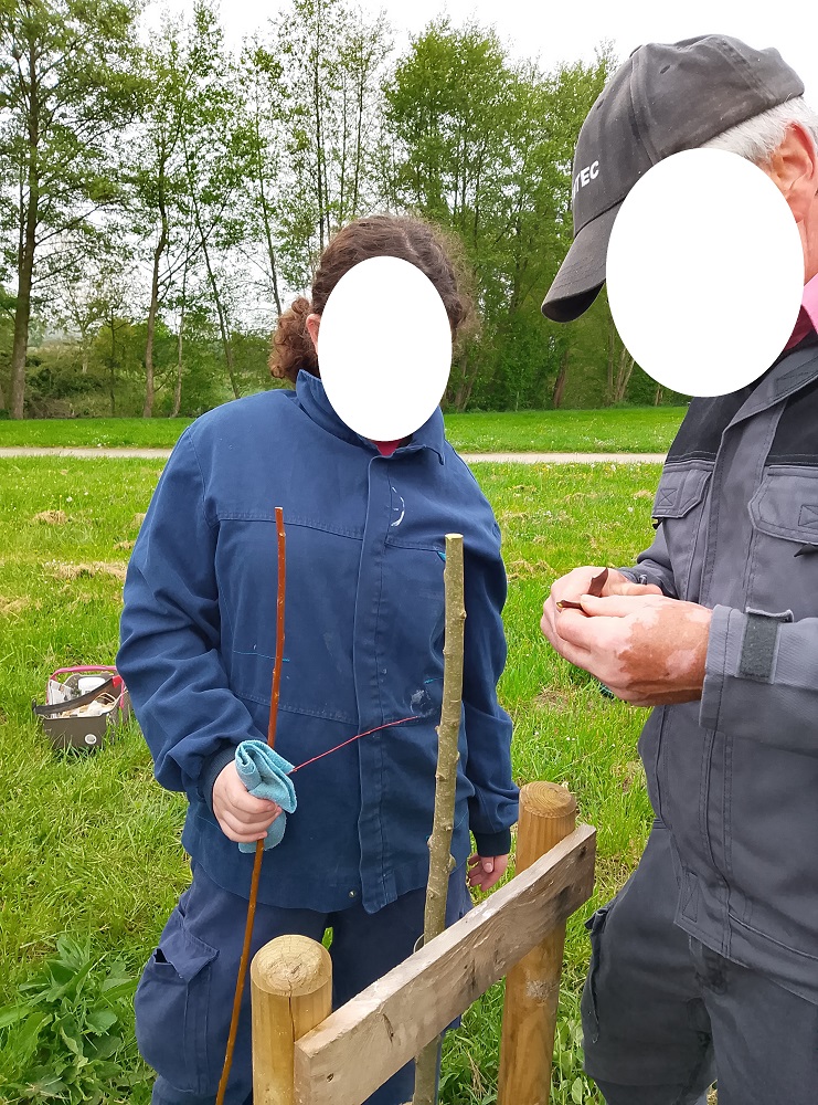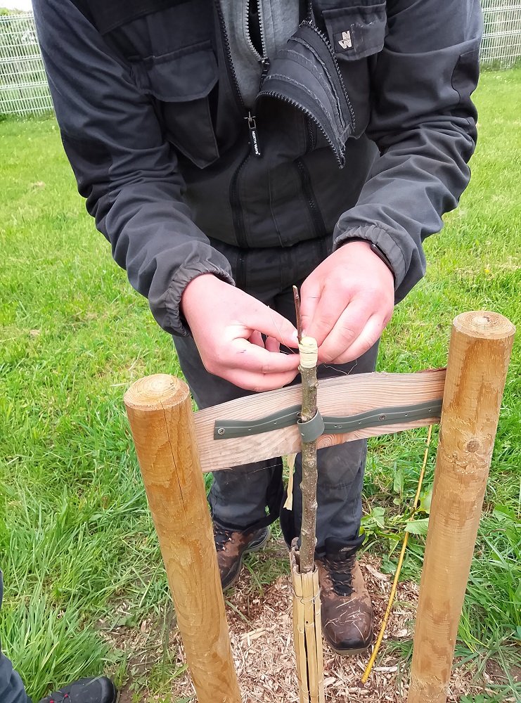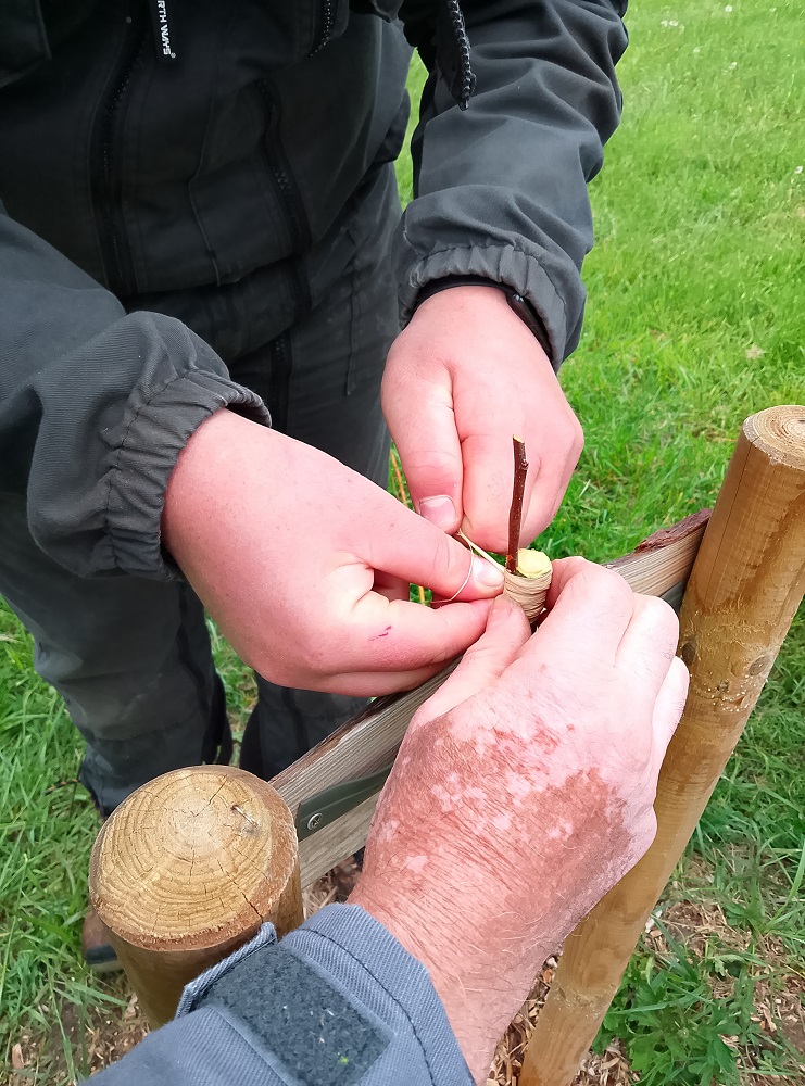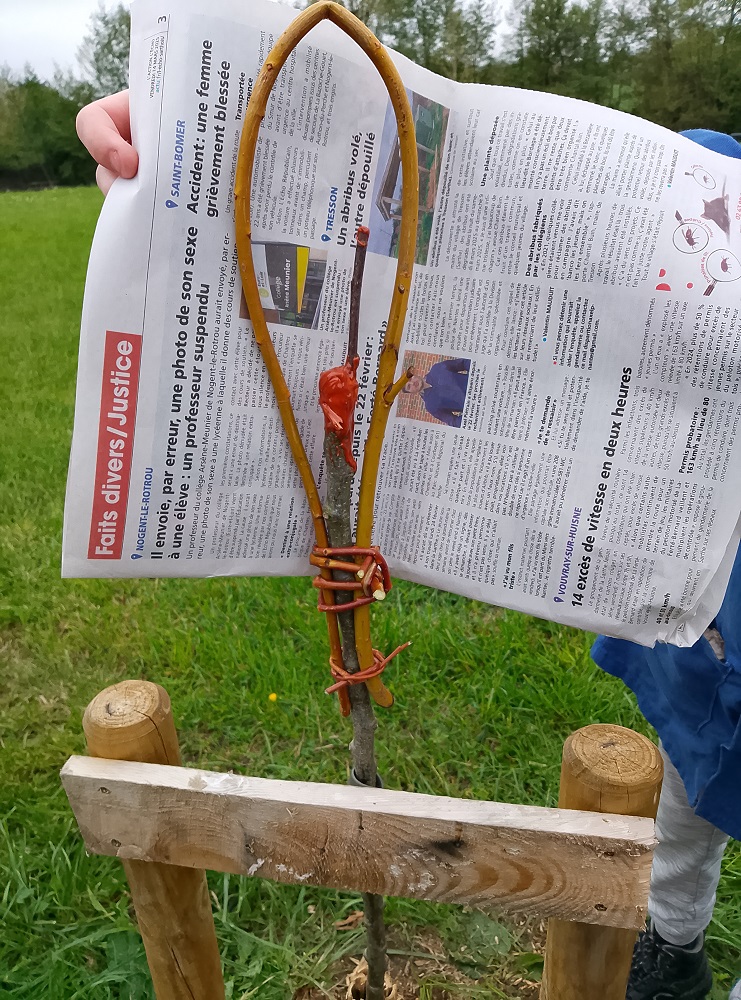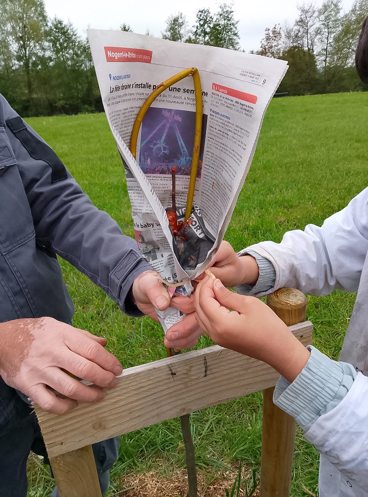 Ils ont préparé les greffons en salle, puis coupé le tronc des jeunes pommiers plantés pour insérer le greffon. Ils ont ensuite lié les deux parties avec du raphia et apposé du mastic ainsi qu'une protection pour les oiseaux, et du journal pour éviter le dessèchement lié au soleil.