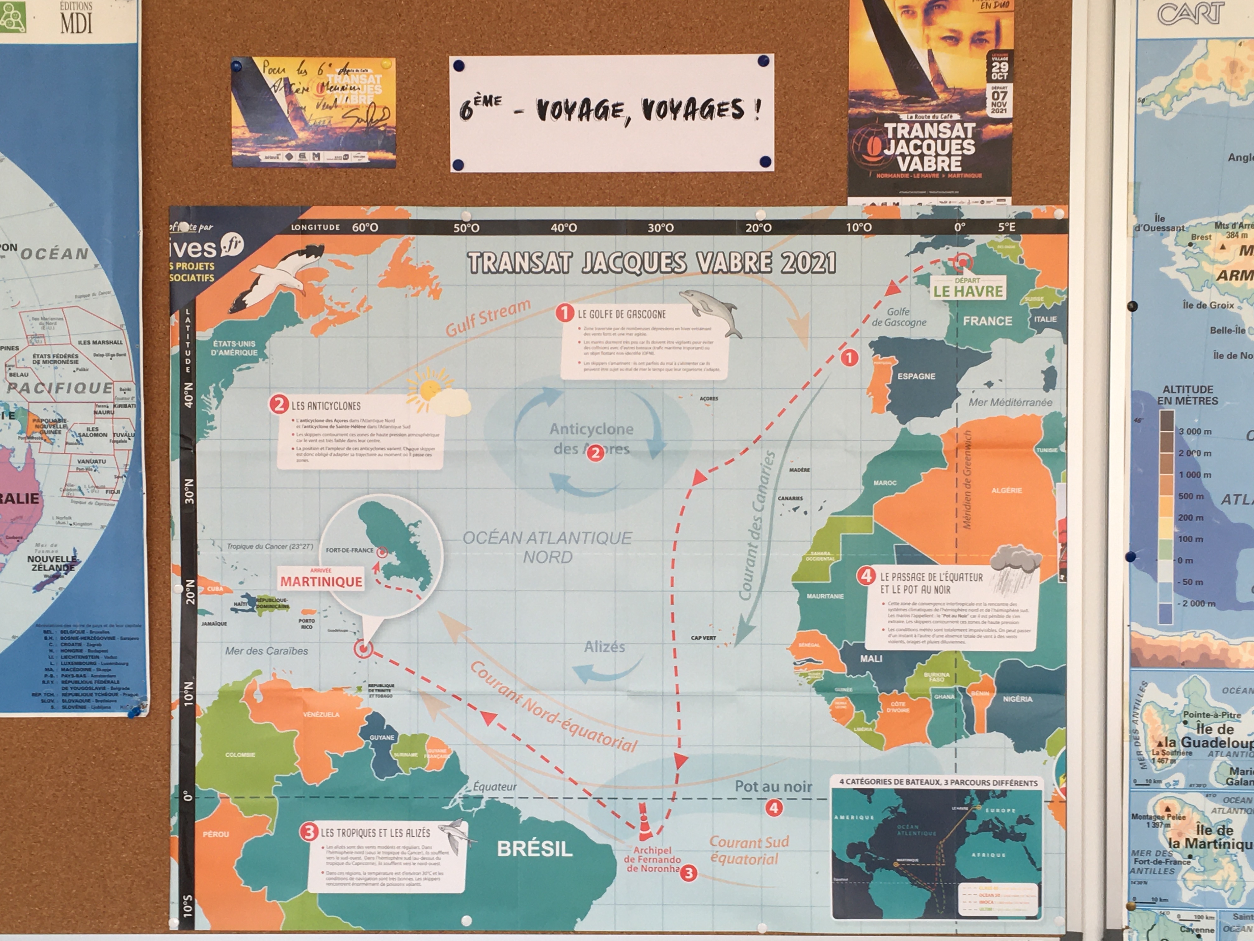 Au retour des vacances de la Toussaint, les classes de 6ème B, C et D ont commencé leur projet de l'année sur le thème : Voyage, Voyages ! Il s'agit d'un projet pluridisciplinaire regroupant la géographie, le français, l'éducation musicale, les arts plastiques et l'EMI.En géographique, l'objectif est de construire un carnet de voyage sur l'année. Le point de départ de notre étude a débuté la semaine dernière avec un suivi quotidien des skippers de la Transat Jacques Vabre. Ces derniers ont laissé quelques petits messages sympathiques aux élèves pour les encourager dans cette initiation au voyage. La seconde étape sera réalisée en arts plastiques avec la customisation de la couverture du carnet par un technique de superposition de collage. La Transat Jacques Vabre en quelques chiffres